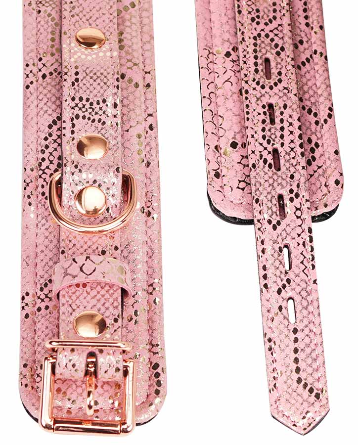 Pink Snake Print Microfiber Wrist Restraints is Lined with Soft Padded Lambskin Leather and Comes with Rose Gold Hardware. Nickle Free Hardware. Locking Buckle.